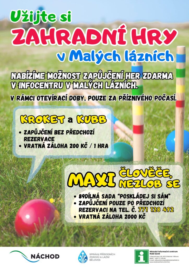 Město Náchod a informační centrum Malé lázně Běloves Vás zve do Malých lázní Běloves. Připravili jsme pro Vás možnost bezplatného zapůjčení zahradních her, a to kroketu a maxi člověče nezlob se. Vybavení si můžete oproti vratné kauci zapůjčit přímo v informačním centru v Malých lázních.