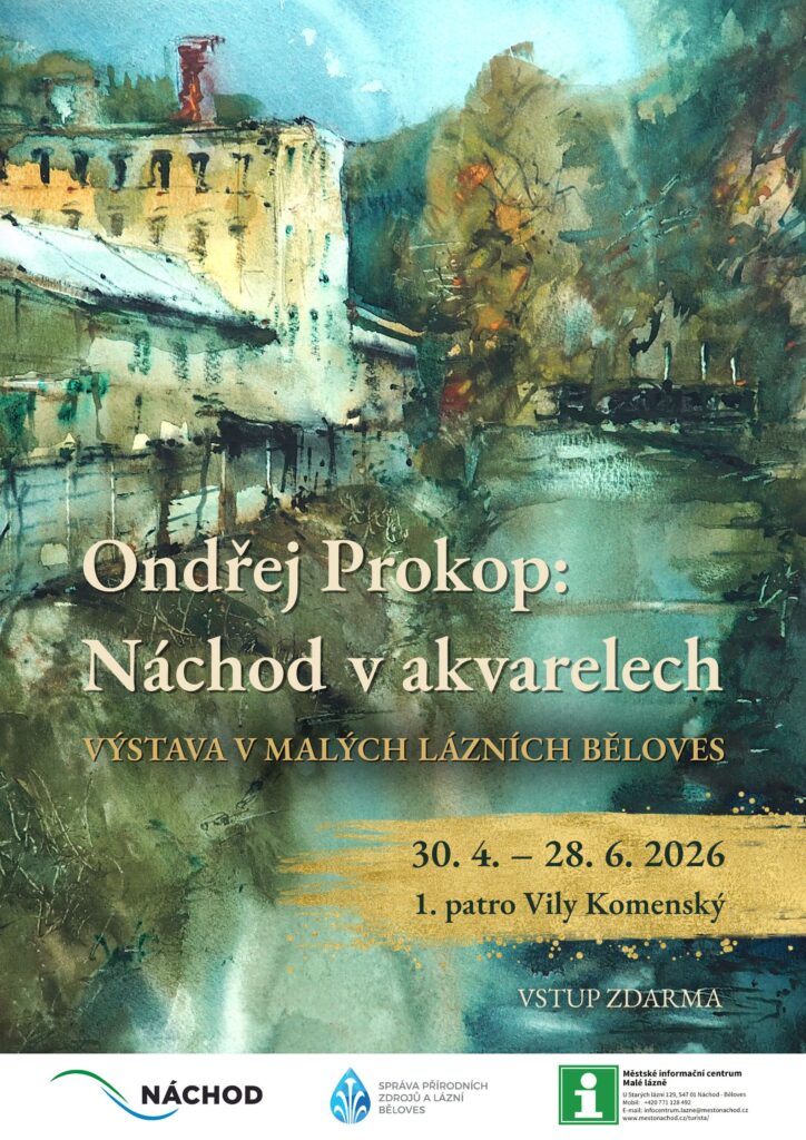 Výstava obrazů Ondřeje Prokopa – Náchod v akvarelech Posted on 16. 3. 2026 by nachod Město Náchod a Městské informační centrum Malé lázně Vás srdečně zvou na výstavu pana Ondřeje Prokopa s názvem Náchod v akvarelech, která se uskuteční od 30.04.2026 do 28.06.2026 v 1. patře Vily Komenský. Vstup na výstavu je zdarma.